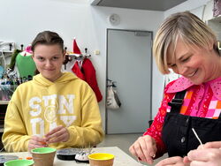 Für die jüngeren Klassen bietet sie vielfältige Möglichkeiten an, sich kreativ auszudrücken: Seifen und Kerzen herstellen, Bilder kleben, Taschen und Kissen nähen, T-Shirts bedrucken und vieles mehr. Bei unserem Besuch basteln die Kinder gerade Weihnachtsengel für den Adventsbasar. Die meisten Schüler*innen sind regulär einmal die Woche im Näh- bzw. Kreativunterricht. Spätestens zu den Märchenprojektwochen im Februar haben dann wirklich alle Schüler*innen die Möglichkeit, in die Werkstatt zu kommen. „Wir machen hier eigentlich alles, was Spaß macht. Auch mal Malen nach Musik.