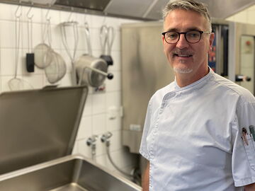 Einen Unterschied zur Küche für Erwachsene macht er nicht. „Nur die Portionsgröße ist unterschiedlich – und ich würze und salze etwas weniger und koche zuckerarm.“ Ansonsten richtet sich der Essensplan nach dem FITKID-Programm der Deutschen Gesellschaft für Ernährung für Kita-Kinder: einmal wöchentlich gibt es Fleisch und Fisch und dreimal Gemüse. „Ein großer Impuls kam auch aus dem Programm „Kantine Zukunft“, mittlerweile verarbeite ich auch viel Hülsenfrüchte und heimische Getreidesorten.“ Die Leidenschaft für gute Küche und das Handwerk Kochen ist in jedem Satz zu spüren. Convenience kommt ihm nicht in die Tüte, selbst 100 Schnitzel werden von ihm noch von Hand paniert. „Das ist mein eigener Anspruch an meinen Beruf. Einfach nur die Kiste aufmachen und die fertigen Schnitzel ins Fett schmeißen, dafür bin ich nicht Koch geworden.“